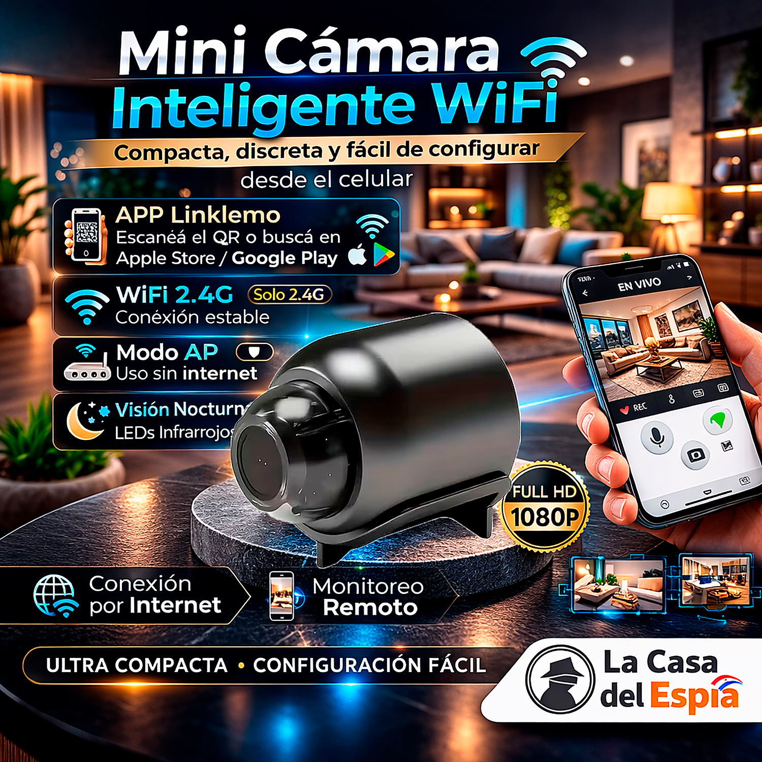 Mini Cámara Inalámbrica WiFi con Soporte (1080p)